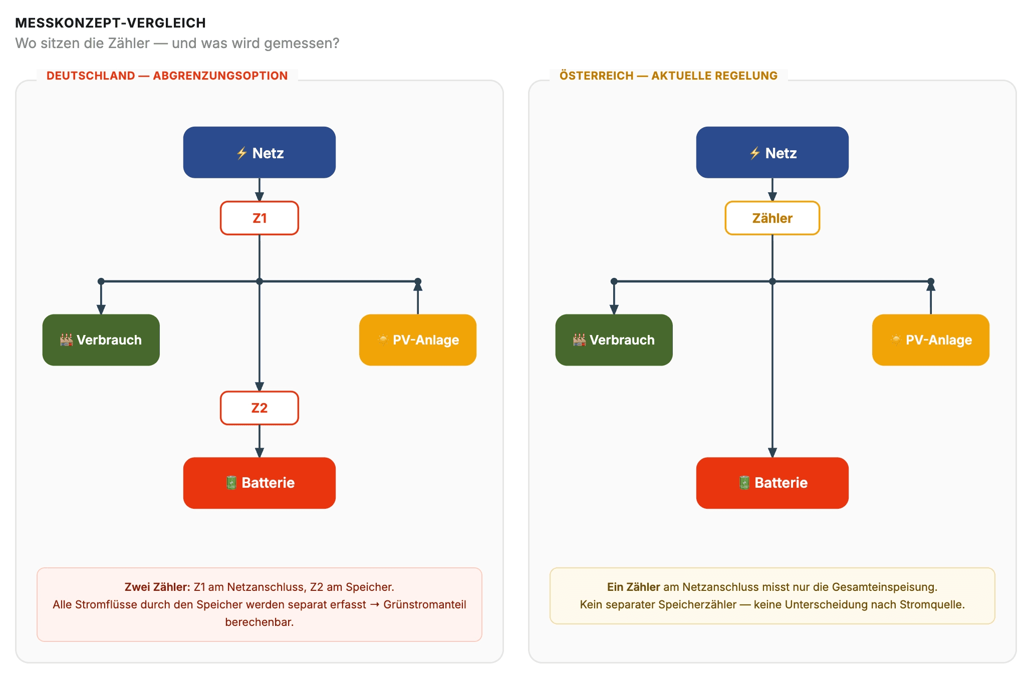 The difference from Germany also lies in metering technology. In Austria, a single bidirectional smart meter at the grid connection point is used as standard. A separate generation meter behind the PV system — as is common in Germany — generally does not exist.